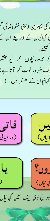 درمیانی عمر کے بچے زندگی کے مناظر کو اپنی آنکھوں سے دیکھنے کی کوشش کرتے ہیں۔ انہیں نصیحت کی لمبی چوڑی باتیں کم ہی بھاتی ہیں۔ پھر ان کو کیسے بتایا جائے کہ آنے والے دور کے زینے کیسے چڑھنے ہیں؟ یہ جاننے کے لیے فاتی اور بلّو کی کہانیاں ضرور پڑھیں۔